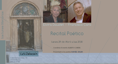 Y como colofón de este mes el próximo Lunes 29 Elvira Daudet junto a Francisco Caro darán un recital poético en el café Zalacaín de Murcia, acto que me hace especial ilusión y que estoy segura será un gran éxito, allí nos vemos