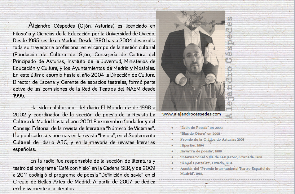 Durante los últimos treinta años como conductor he dejado a mi espalda más de un millón de kilómetros. Pero hay tres cosas de la carretera que cada vez que las encuentro en mi camino siguen produciéndome una inmensa desolación: cadáveres de animales, zapatos desperdigados y ramos de flores. Sobre esa desolación, sobre los dramas anónimos que señalan esas cosas, circula este libro. Alejandro Céspedes |